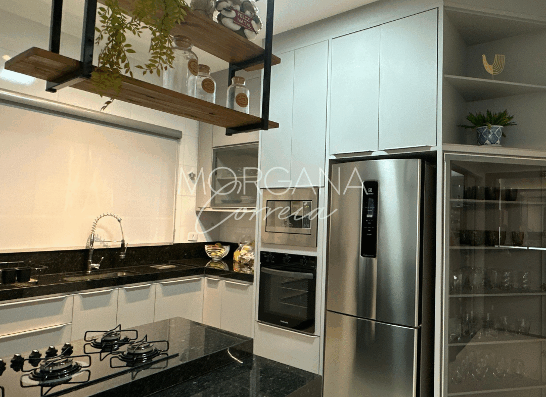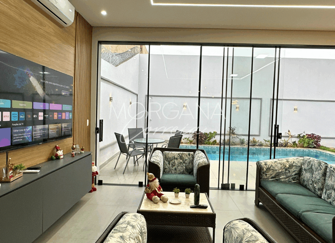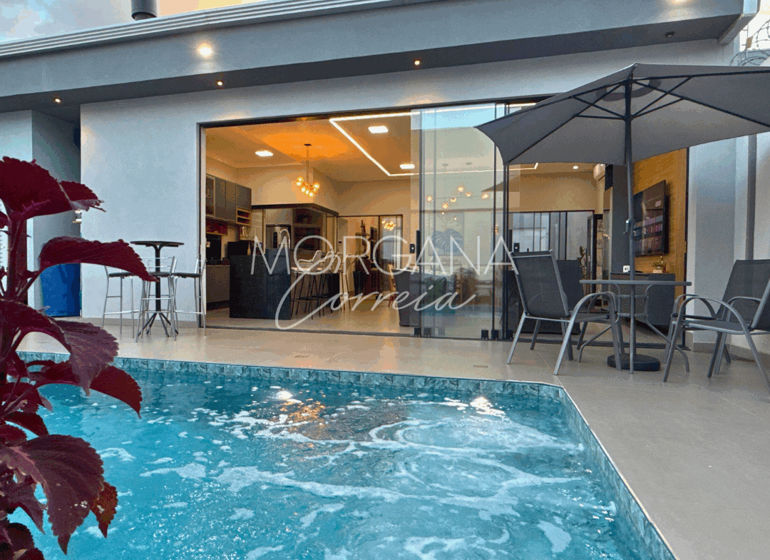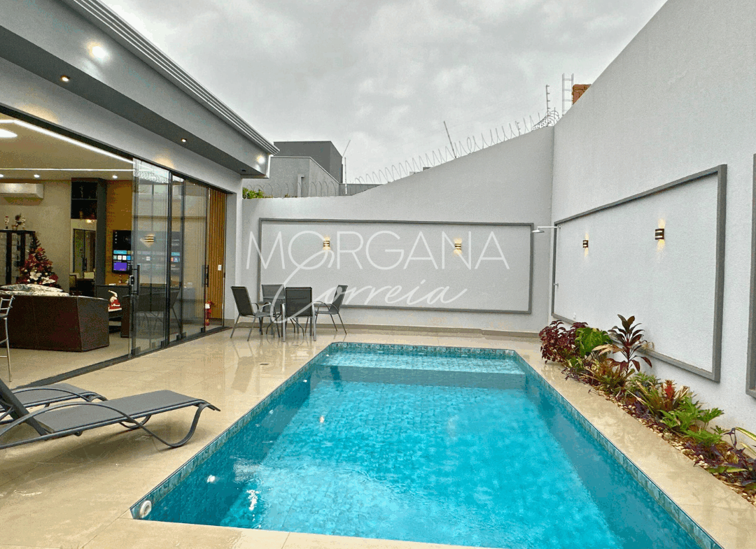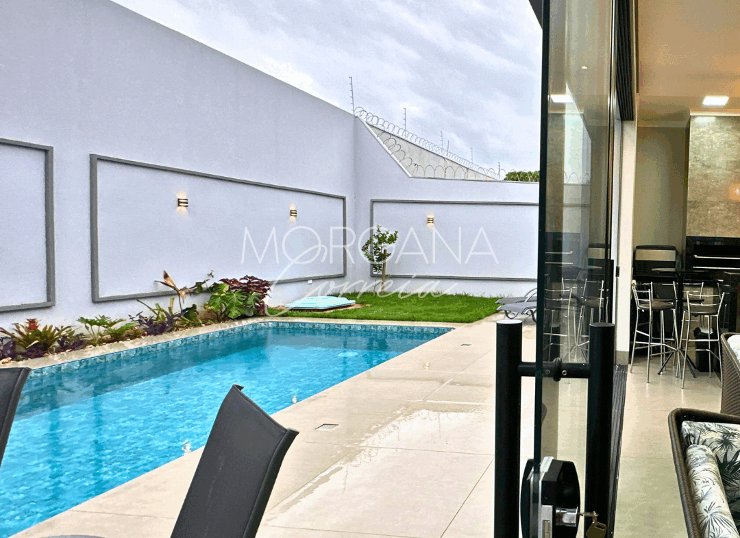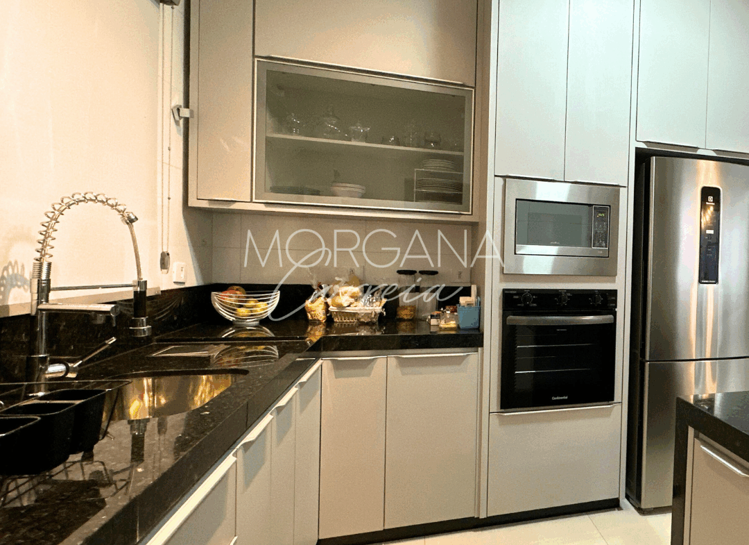 A cozinha planejada é funcional e conta com despensa. Na área externa, o destaque fica para o espaço de lazer com piscina, churrasqueira e jardim, ideal para momentos de convivência. Dispõe ainda de área de serviço, varanda, e quatro vagas de garagem.