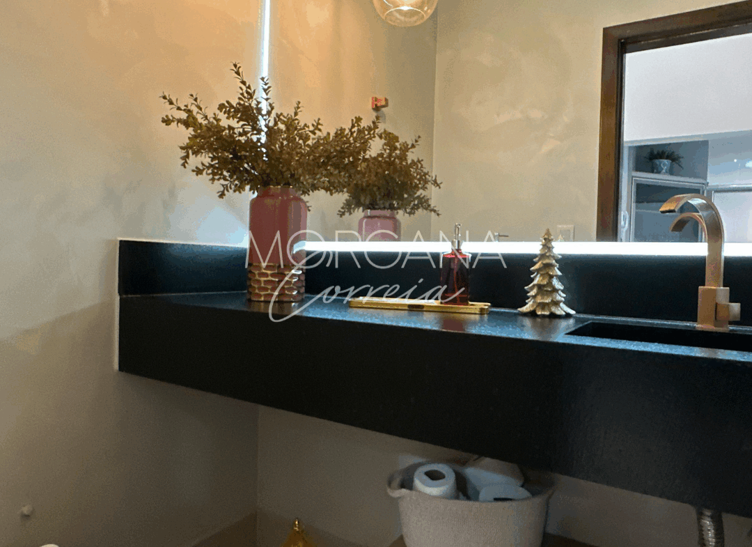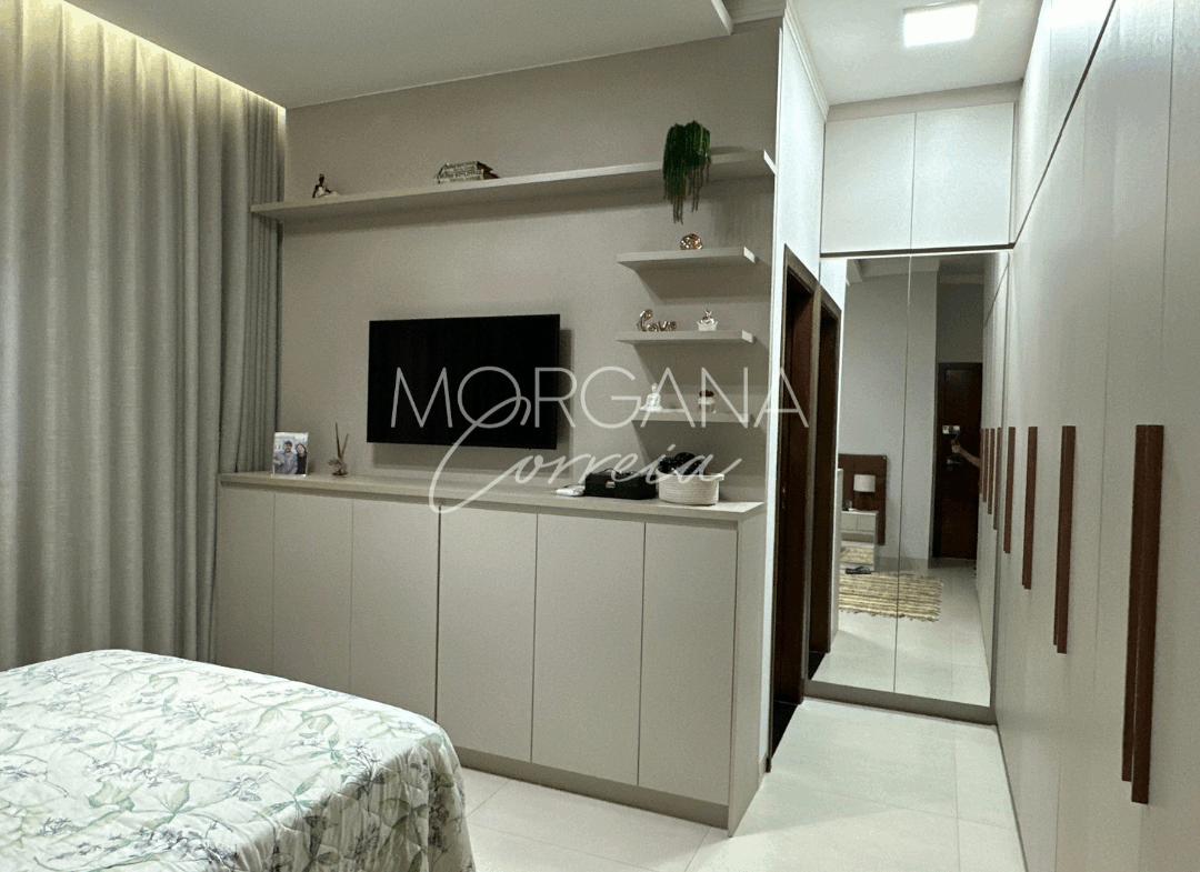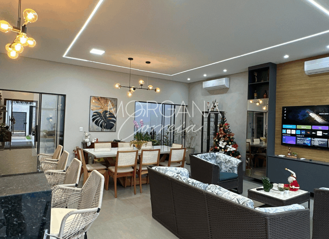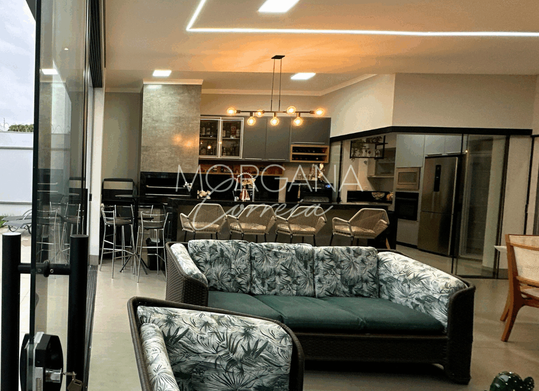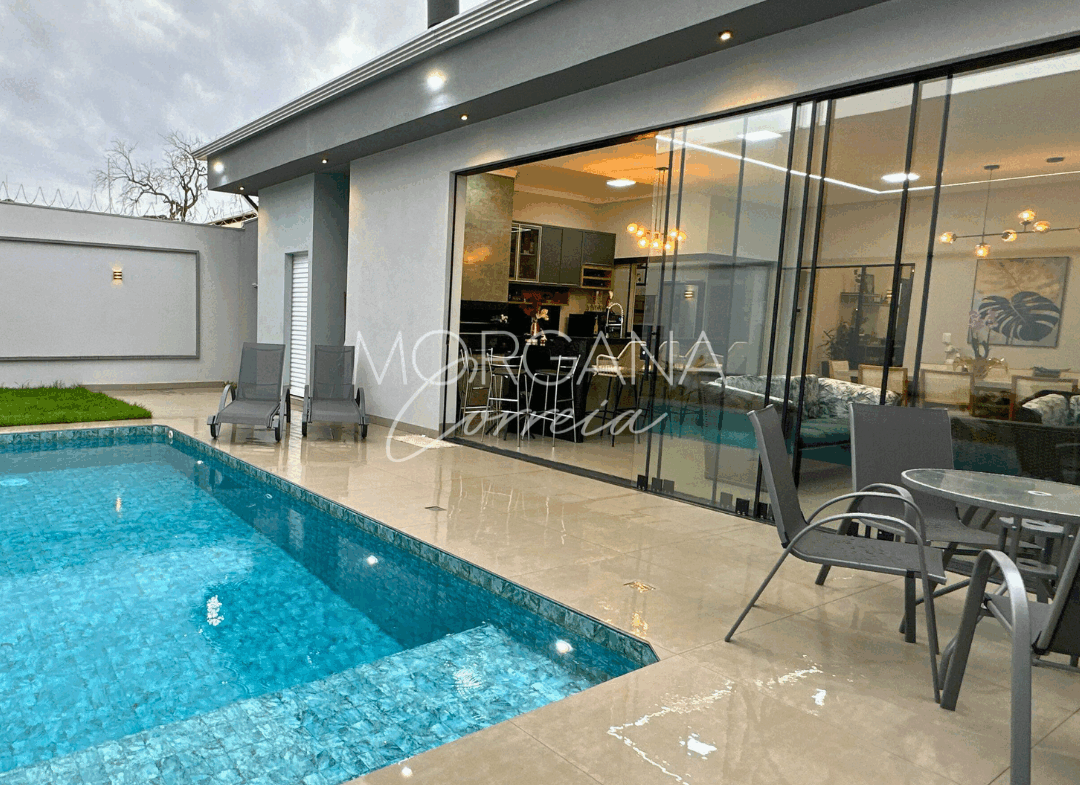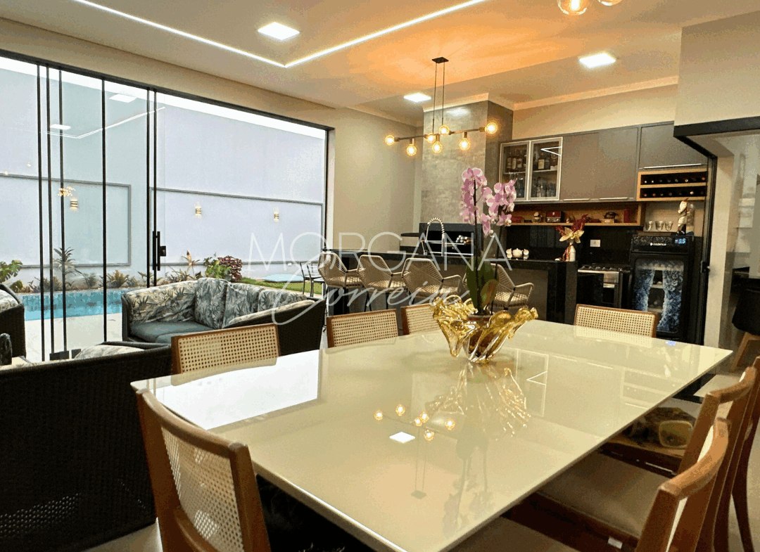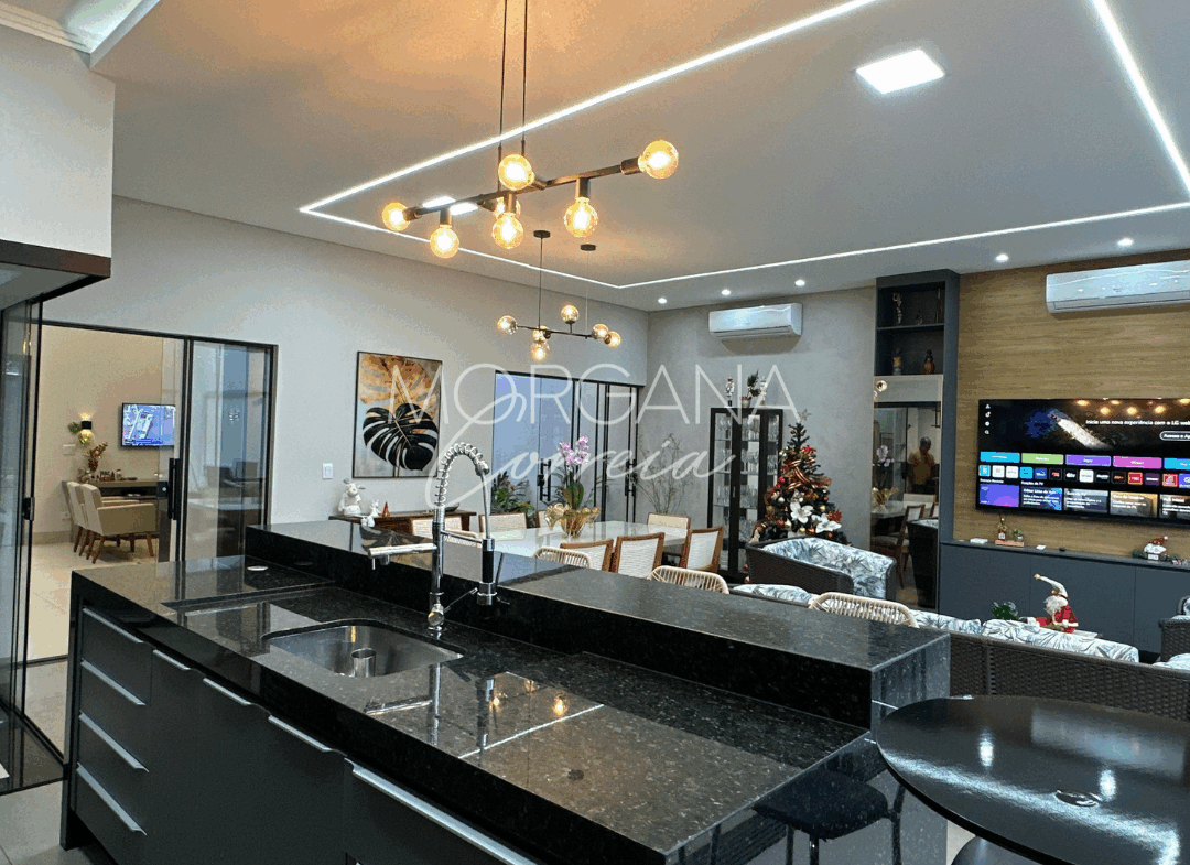 A cozinha planejada é funcional e conta com despensa. Na área externa, o destaque fica para o espaço de lazer com piscina, churrasqueira e jardim, ideal para momentos de convivência. Dispõe ainda de área de serviço, varanda, e quatro vagas de garagem.