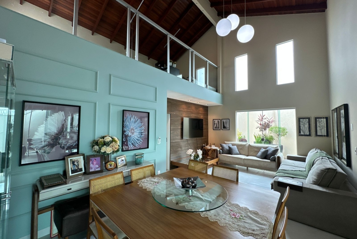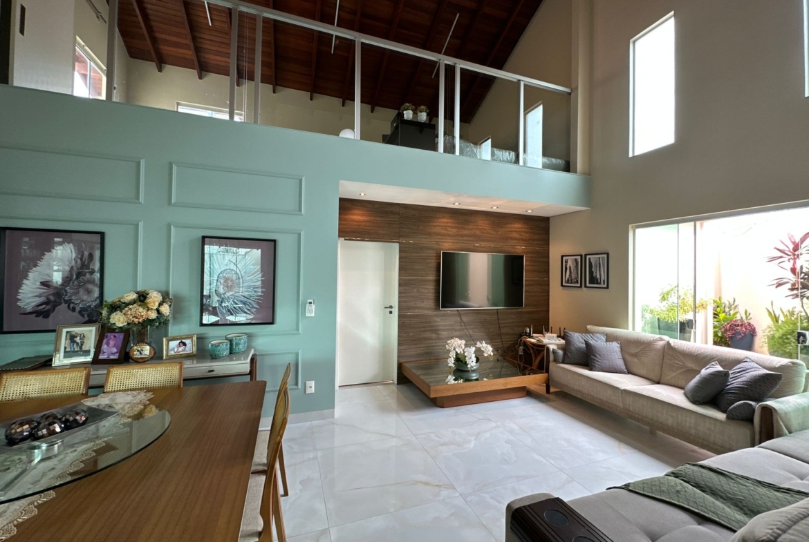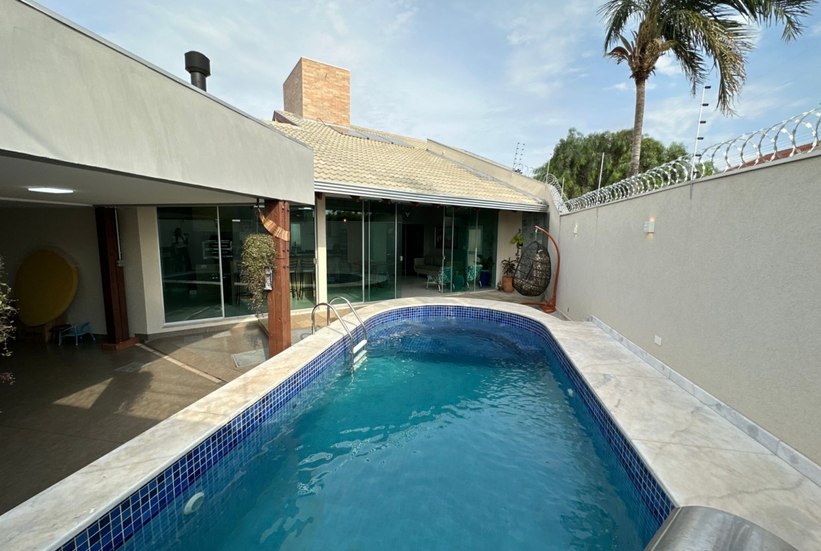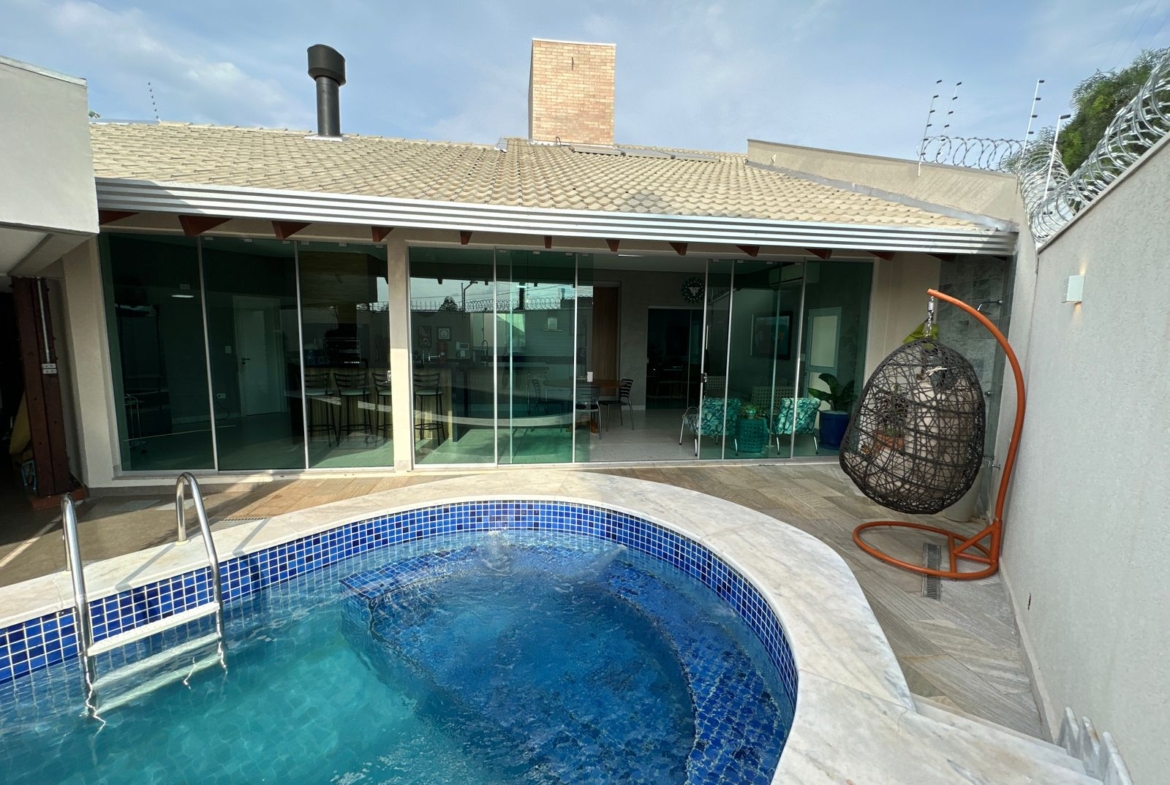 Casa de esquina com 360m² de terreno e 260m² de área construída, projetada para oferecer conforto, praticidade e elegância. O imóvel conta com sala de jantar, sala de TV, uma suíte com armários planejados e hidromassagem, dois quartos também com armários, dois banheiros sociais, lavabo, mezanino e cozinha planejada. A área externa é perfeita para receber amigos e familiares, com varanda gourmet equipada com churrasqueira, água quente e uma bela piscina.
