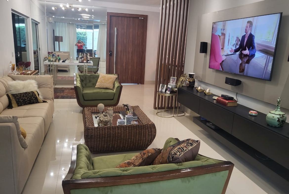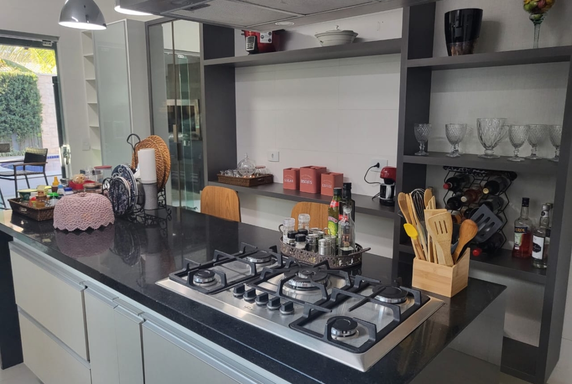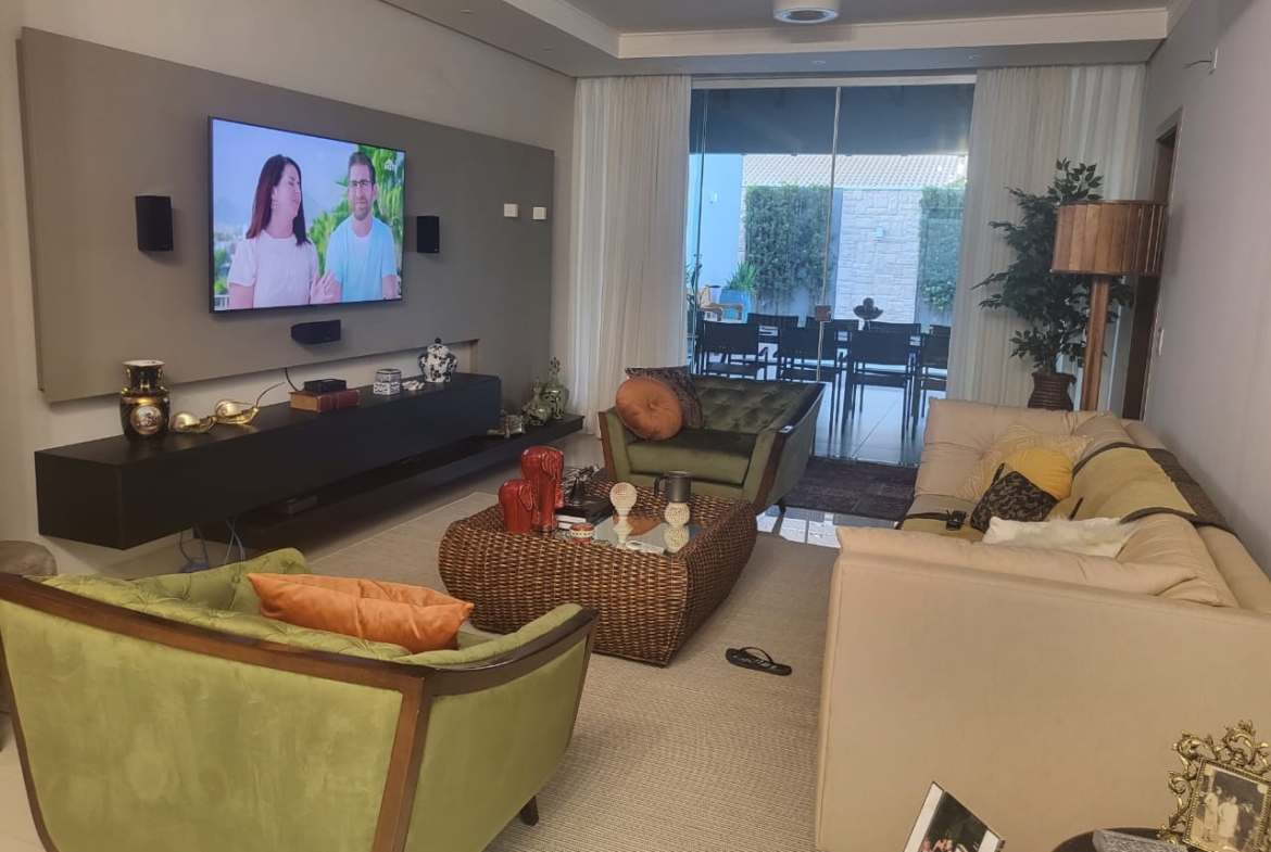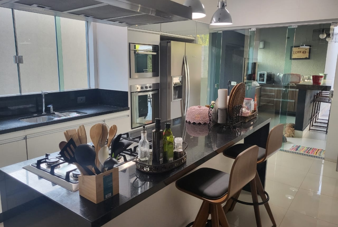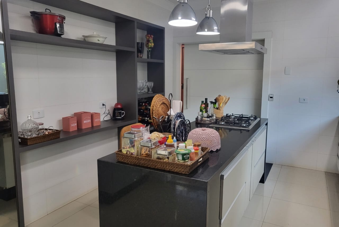 Conta com três suítes amplas com armários planejados, além de salas integradas de estar, jantar e TV, que garantem amplitude e luminosidade natural. A cozinha é totalmente planejada e se conecta à área gourmet com churrasqueira, ideal para momentos de convivência e lazer em família.
