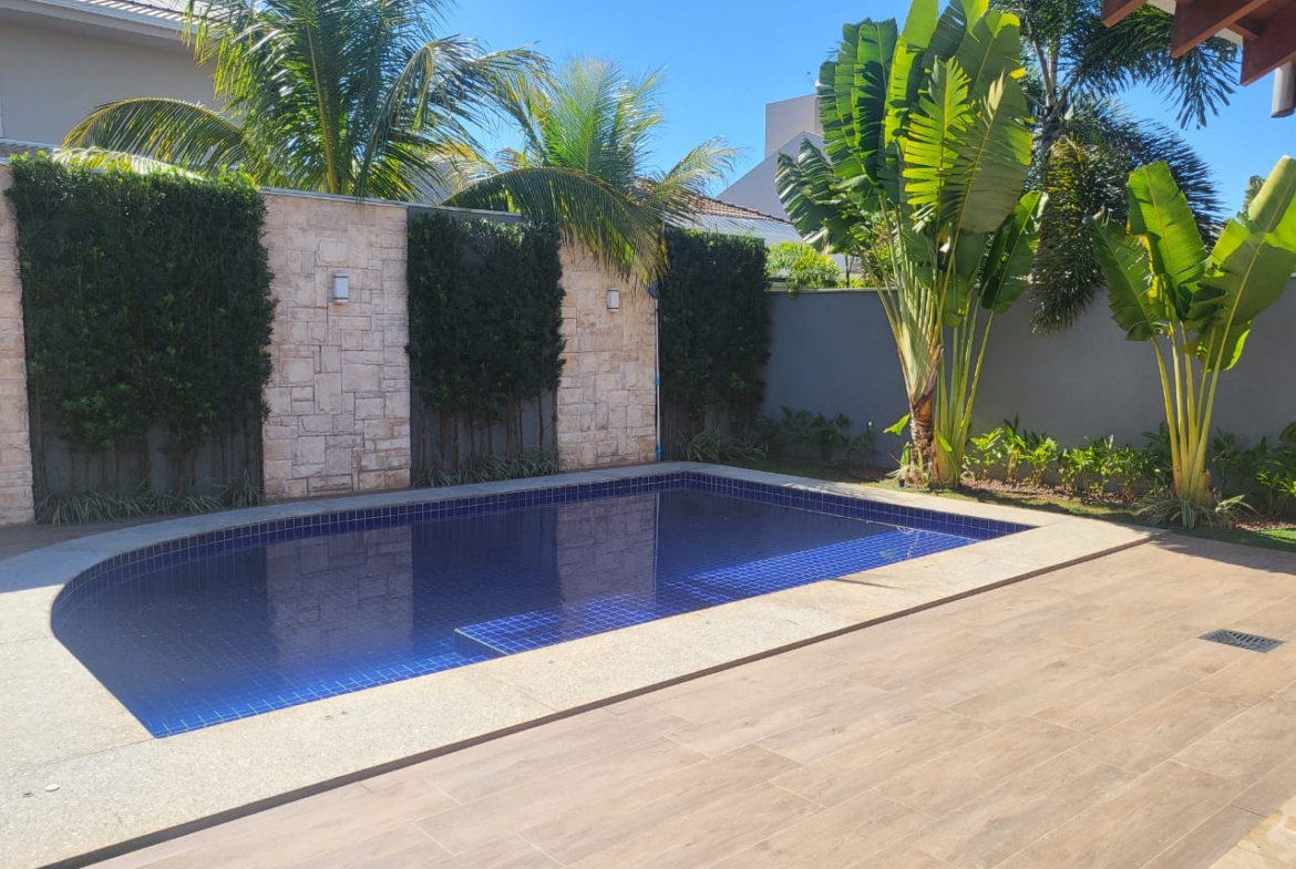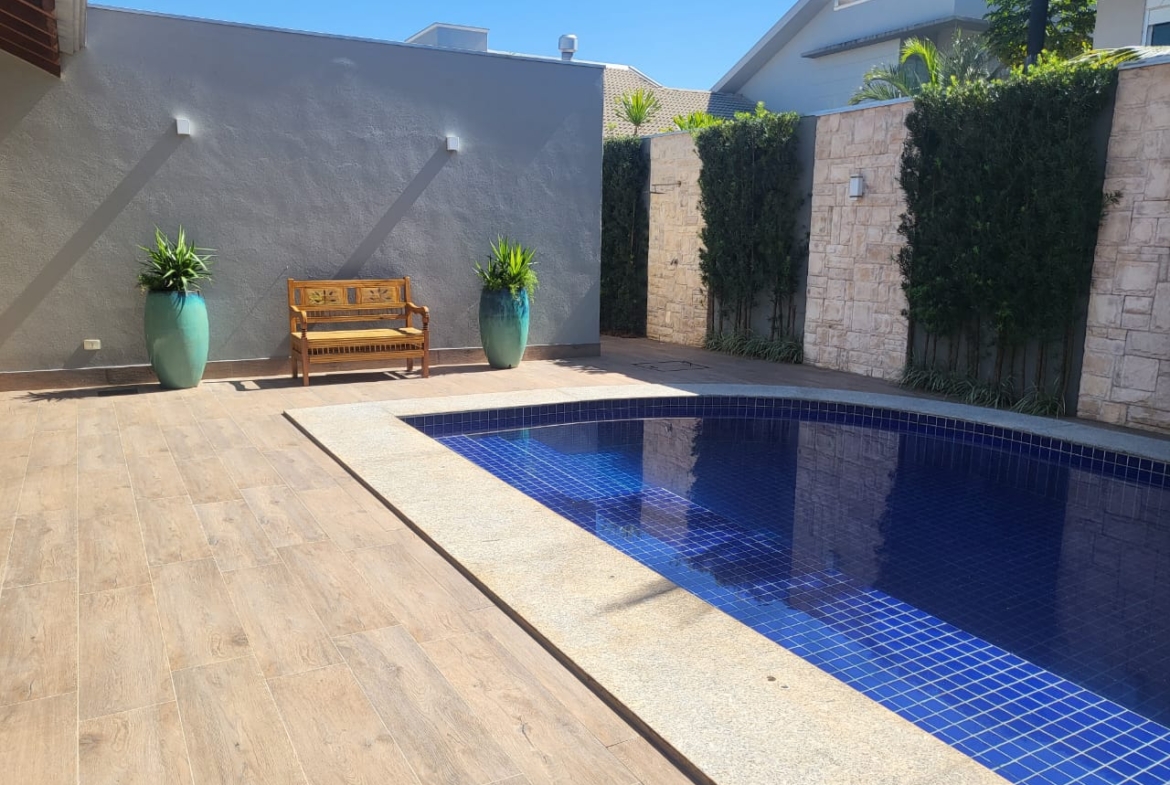A área externa é um destaque à parte, com piscina, jardim com árvores frutíferas e varanda espaçosa, criando um ambiente acolhedor e relaxante. O imóvel dispõe ainda de lavabo, lavanderia e quatro vagas de garagem.