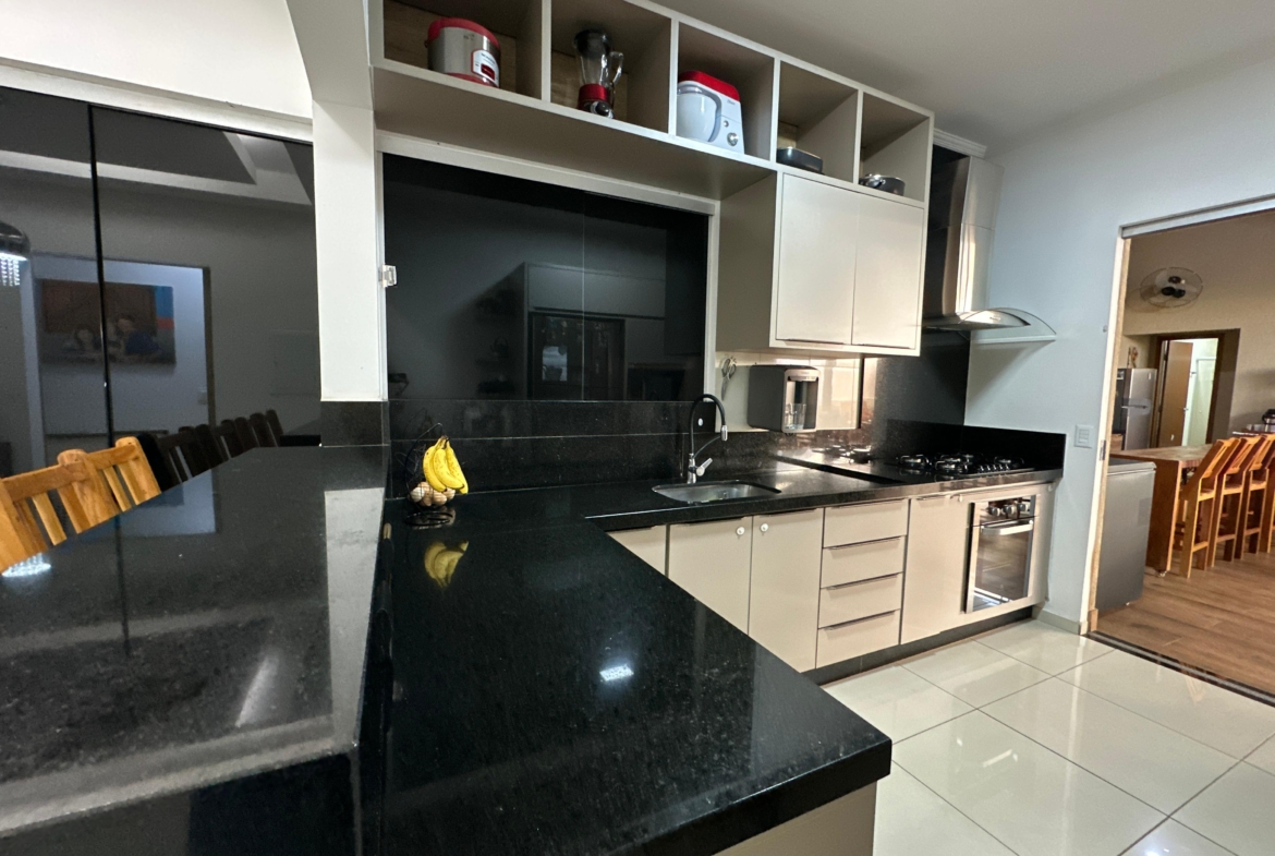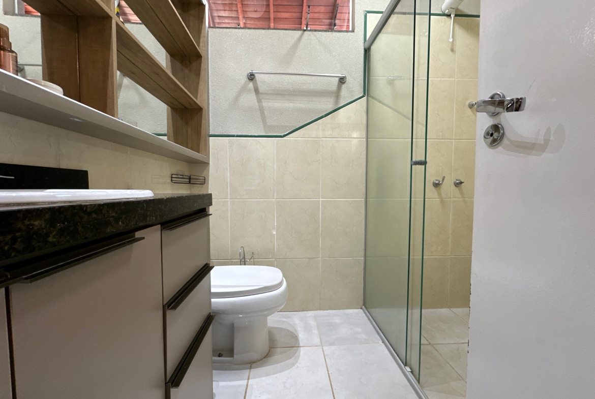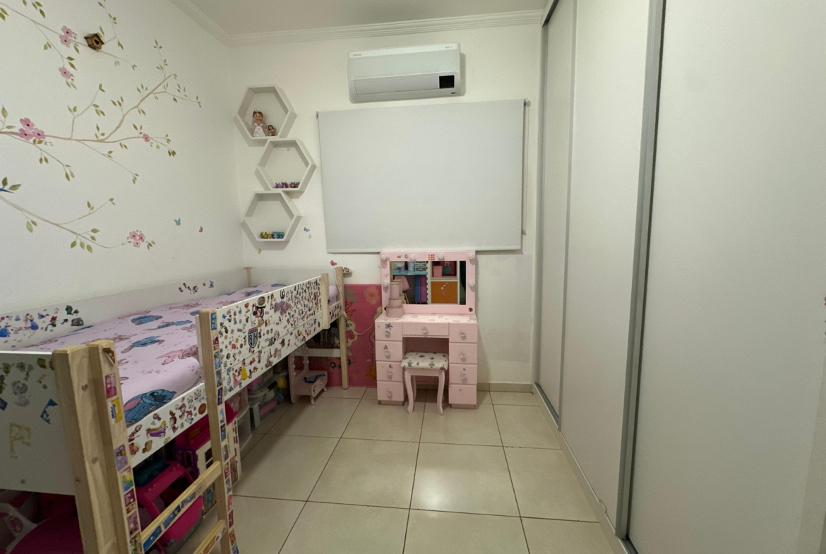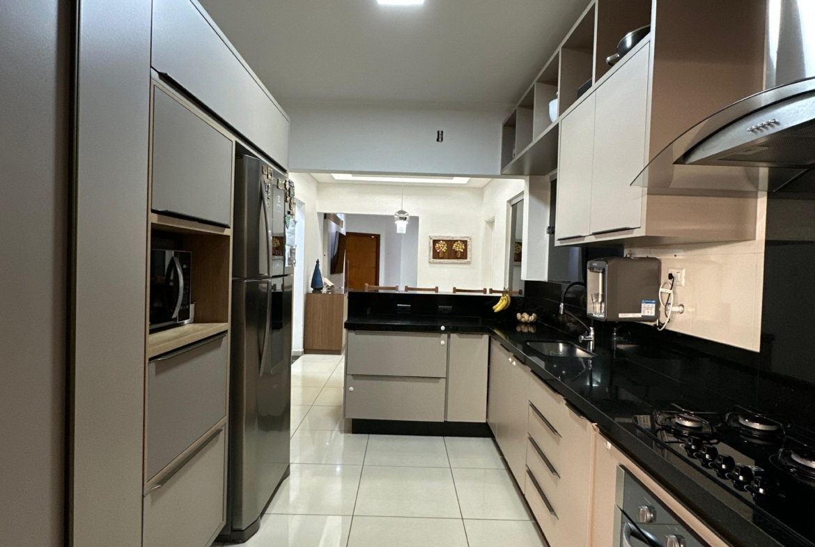 Possui 1 suíte com armário planejado, 2 quartos com armários, 1 quarto adicional, banheiro social, sala de jantar, sala de TV, lavabo, cozinha americana planejada e lavanderia.