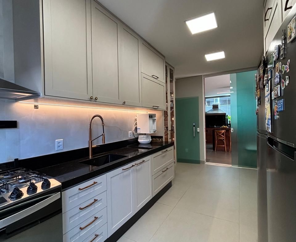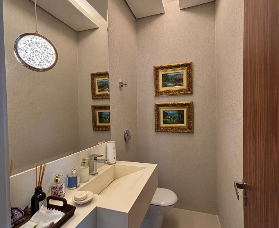 No térreo, são três suítes amplas, sala de estar e jantar integradas, cozinha com despensa, lavanderia e uma charmosa área gourmet com banheiro de apoio e piscina aquecida.
