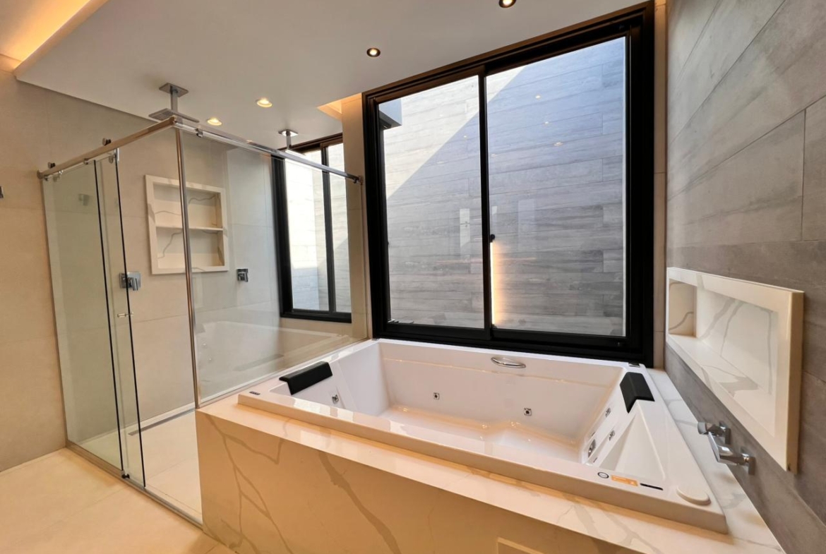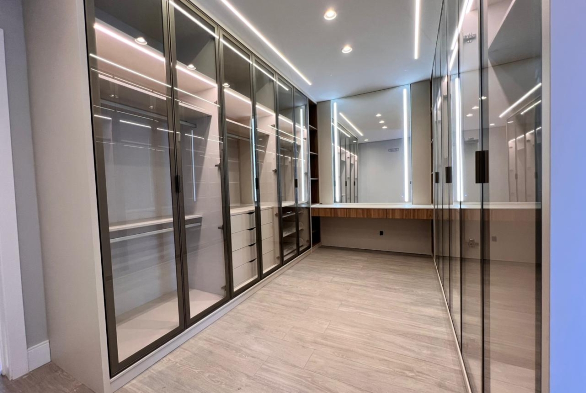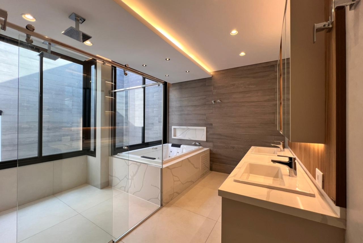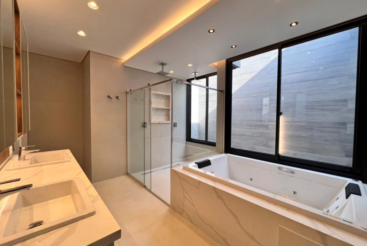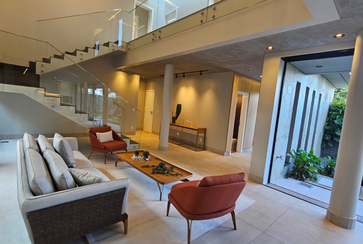 O imóvel conta com 5 suítes, sendo 1 no térreo e 4 no piso superior. Na suíte principal, há uma sala de banho com jardim de inverno, proporcionando um ambiente de relaxamento e sofisticação.