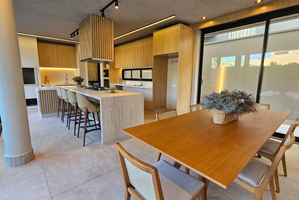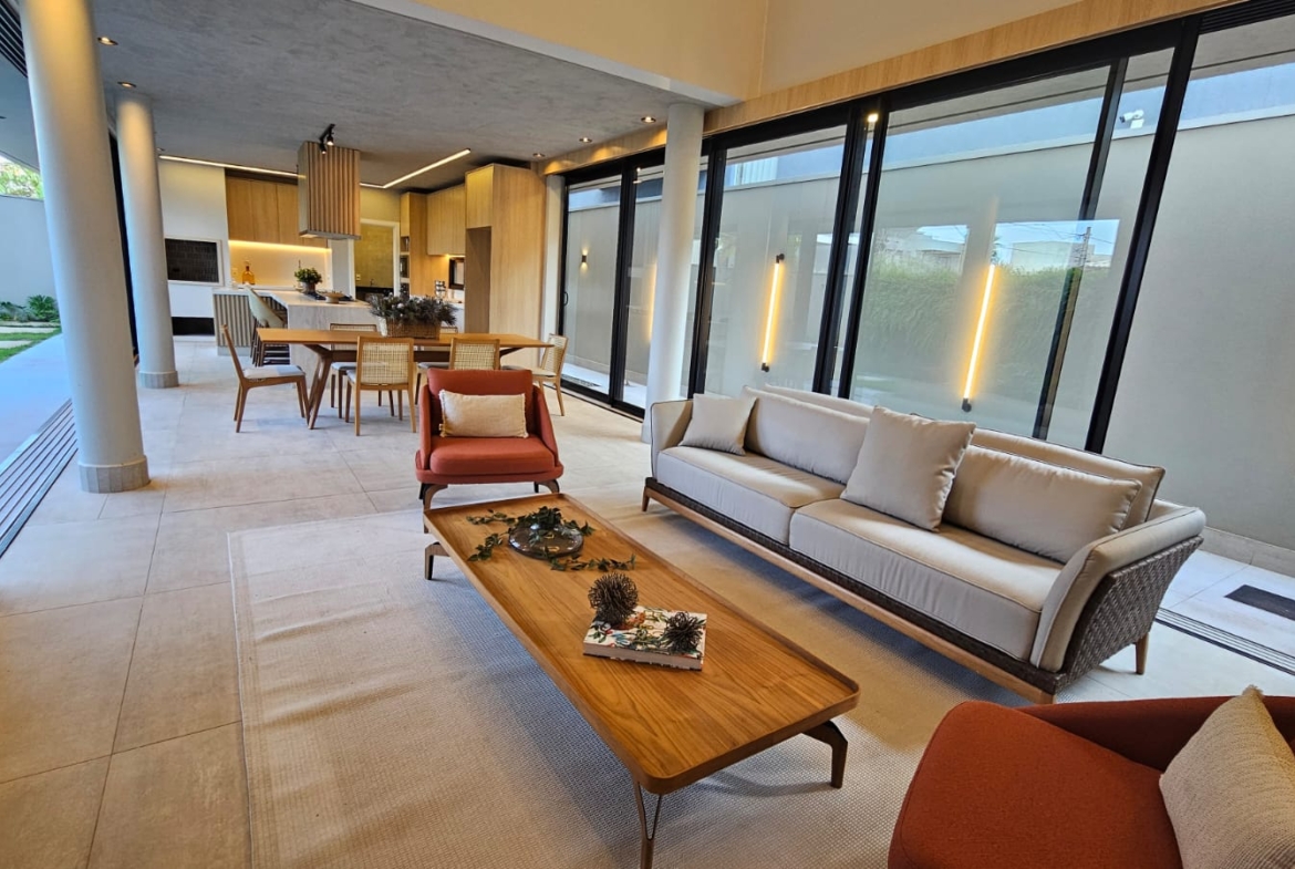 Possui lavabo, sala de visita, sala de jantar, cozinha com ambientes integrados, lavanderia, despensa e piscina. O projeto conta ainda com jardinagem completa e planejados na cozinha e nos banheiros. A garagem é coberta para 3 carros.