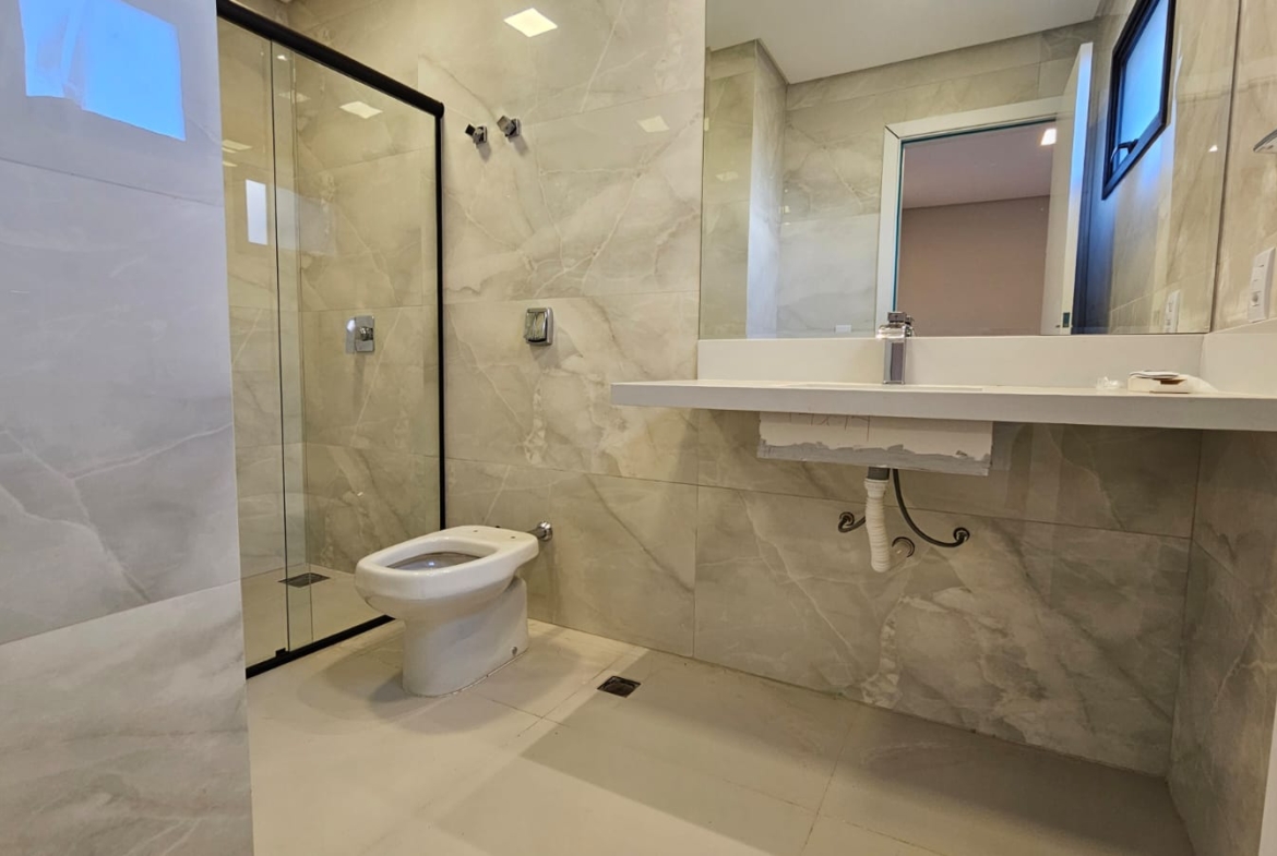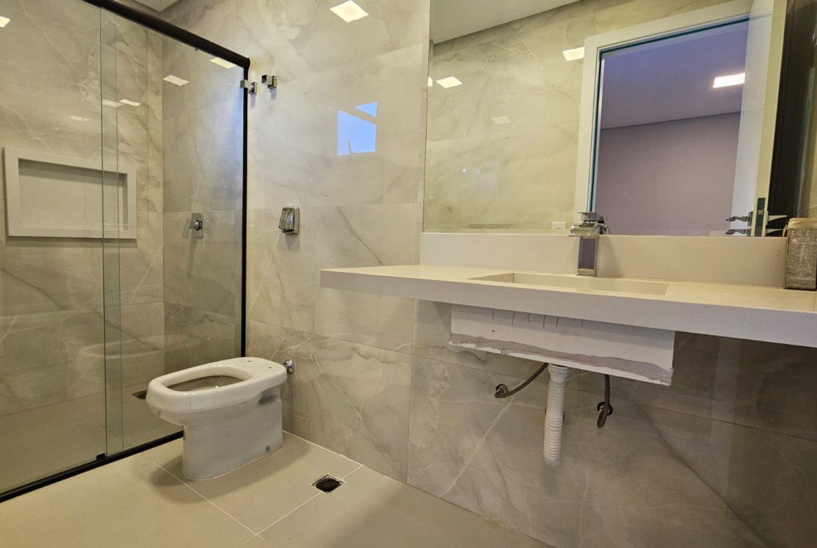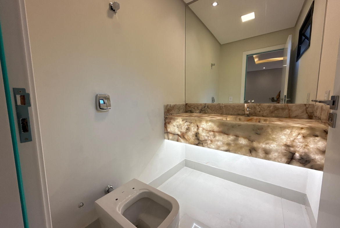 Para o lazer, o imóvel dispõe de piscina aquecida revestida em porcelanato 72 x 72 cm, além de um belo jardim com iluminação especial. O padrão de acabamento impressiona: esquadrias de alumínio linha Suprema, pisos porcelanato polido 106 x 106 cm nas áreas sociais, granito Andorinha 100 x 100 cm no exterior, piso vinílico amadeirado no pavimento superior e porcelanatos 60 x 120 cm nos banheiros. As bancadas seguem um alto nível de elegância, incluindo quartzo Stellar branco na suíte, prime branco nos banheiros dos apartamentos, ônix natural no lavabo, preto São Gabriel na cozinha e preto Via Láctea na área gourmet e escada. Toda a casa apresenta gesso rebaixado com iluminação embutida e decorativa, além de um projeto luminotécnico completo em todos os ambientes internos, externos e jardins. Imóvel impecável, pronto para financiamento e ideal para quem busca conforto, segurança e requinte em uma das melhores regiões da cidade.